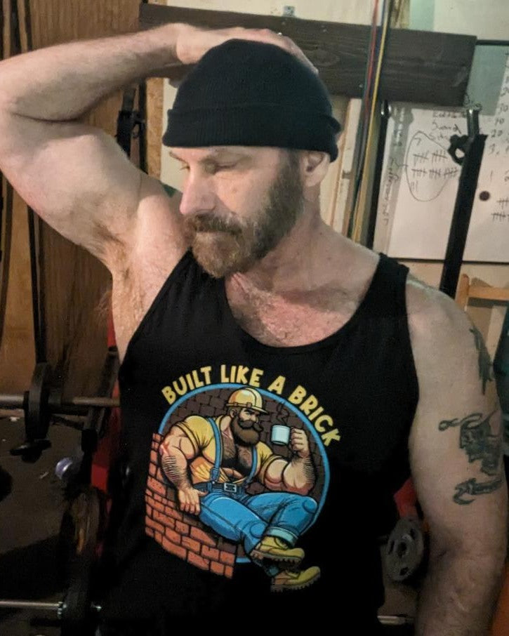 Celebrate your solid foundation with the Built Like a Brick Tank. This tank is a tribute to the sturdily built man, proud of his robust frame and unshakable confidence. Adorned with a beefy, bearded character taking a well-deserved break on a wall of bricks, it's a playful wink to those with the strength of stone and the heart of gold.
