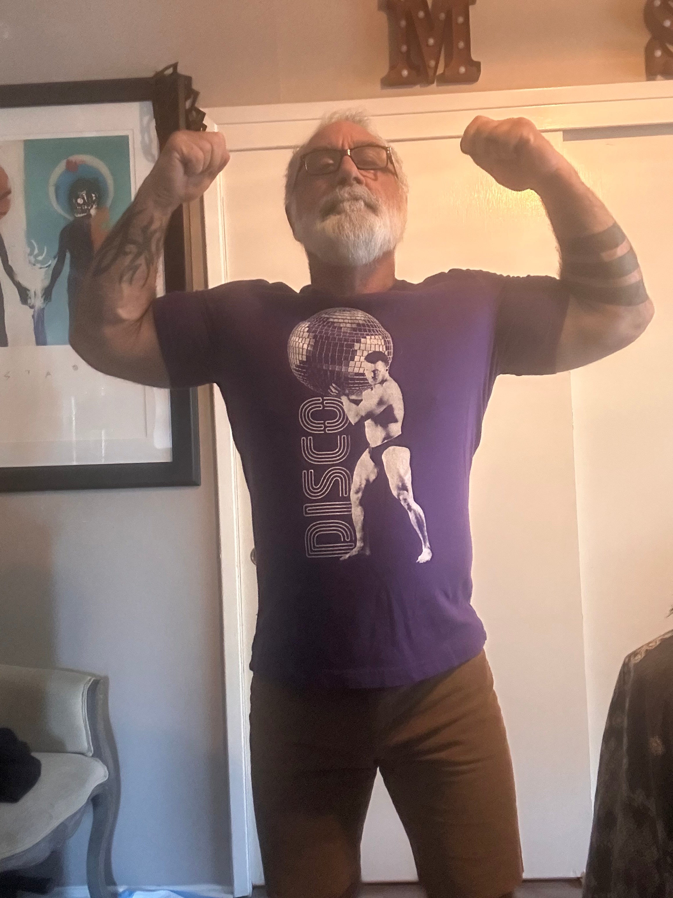 Designed with comfort and style in mind, this high-quality tee is perfect for those who aren't afraid to show off their strength and their love for the classic era of disco. Just like the man in the design, be the one to carry the party wherever you go.