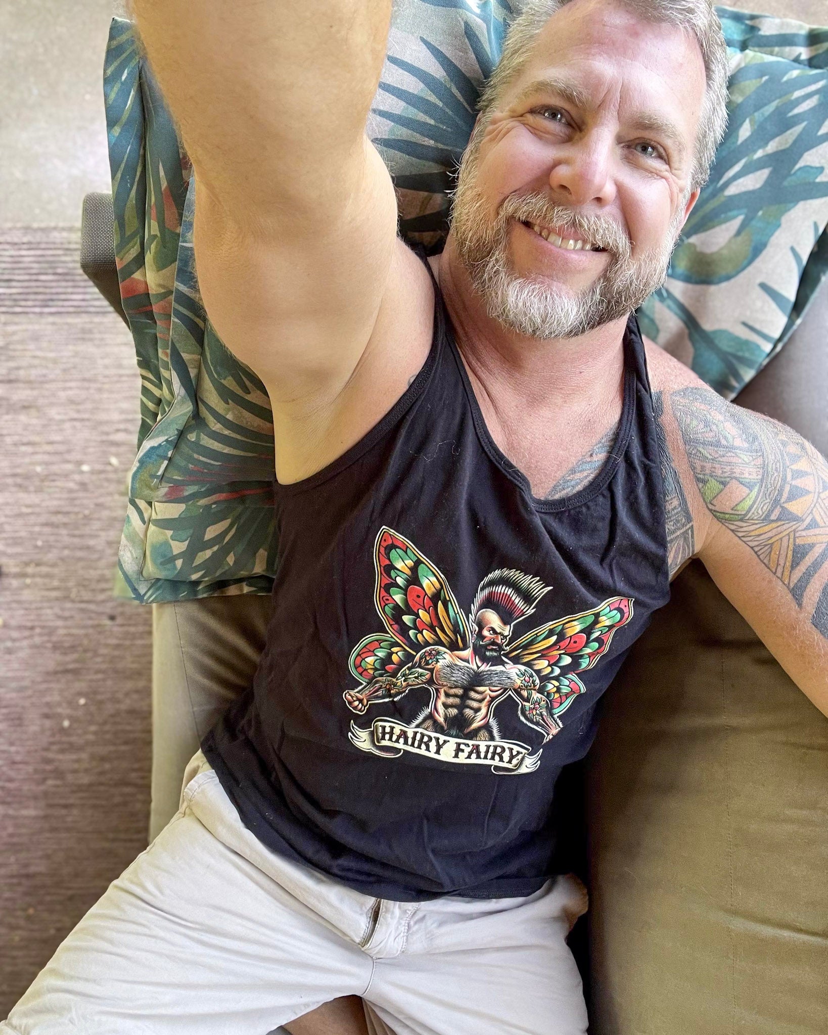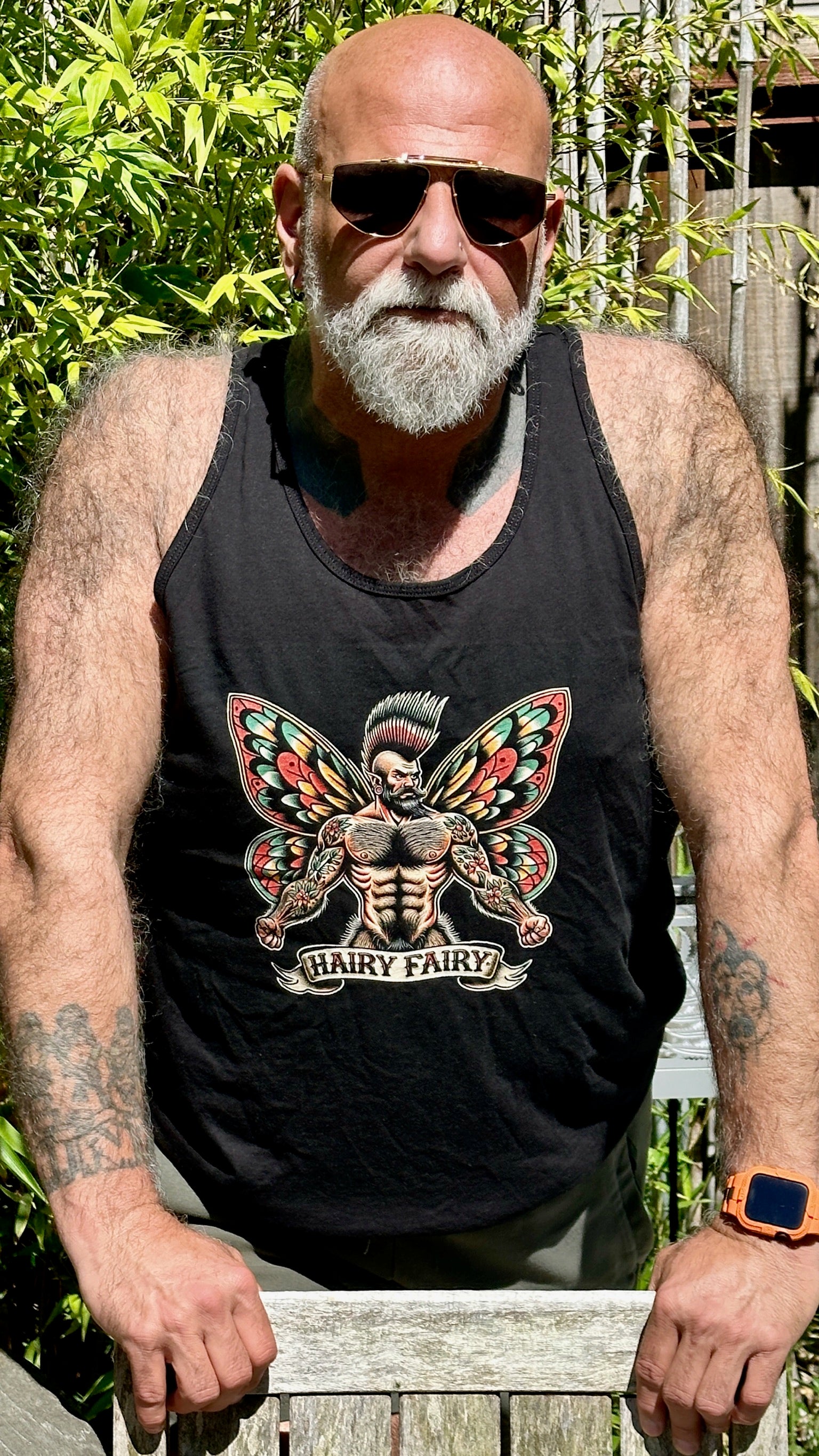 Feel confident and unstoppable as you showcase your muscled physique in this eye-catching design. The "Hairy Fairy" graphic features a powerful, tattooed figure with striking fairy wings, symbolizing the fusion of rugged masculinity and whimsical charm. Whether you're hitting the gym, strutting your stuff at Pride events, or simply owning your everyday look, this tank top reminds you to stand tall and be unapologetically you.