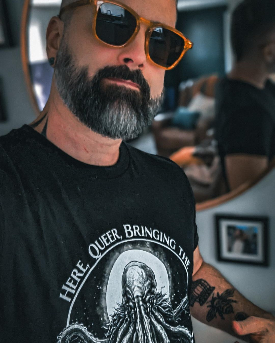 Express your love for the Lovecraftian universe and your pride with our Queer Eldritch Fear T-Shirt! This captivating tee brings together the mythical realm of Cthulhu and LGBTQ+ pride in a unique way, making it a perfect piece for fans of Lovecraft and members of the queer community alike. The empowering phrase "Here, Queer, Bringing the Eldritch Fear" adds a playful, powerful twist to this shirt, making it a standout piece in your wardrobe. With its comfortable fit and high-quality print, it's perfect for literature-themed gatherings, Pride events, or to make a bold statement in your everyday life.